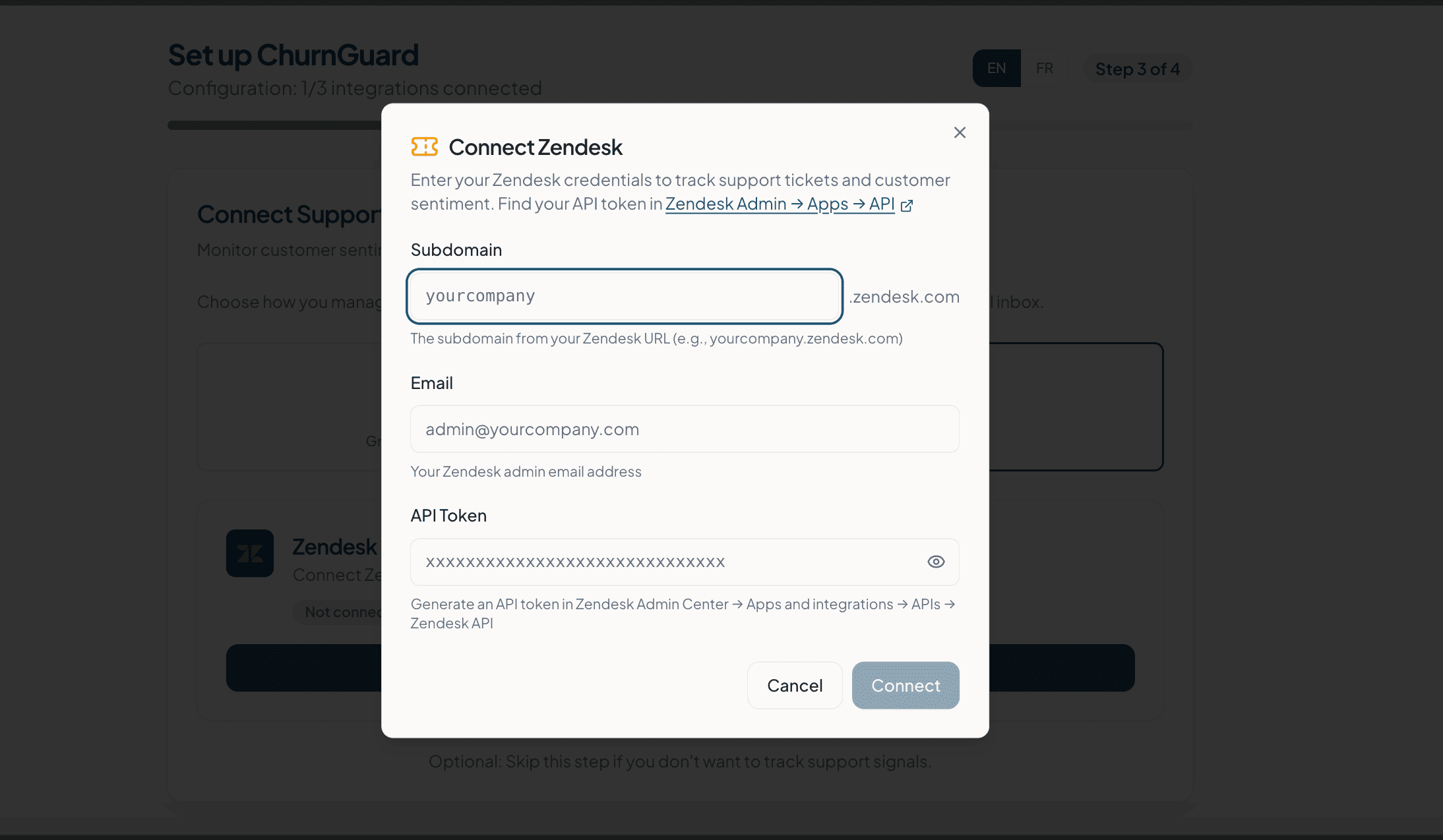 Choisissez cette option si vous utilisez Zendesk comme outil de ticketing. ChurnGuard se connecte directement à votre compte via API.
