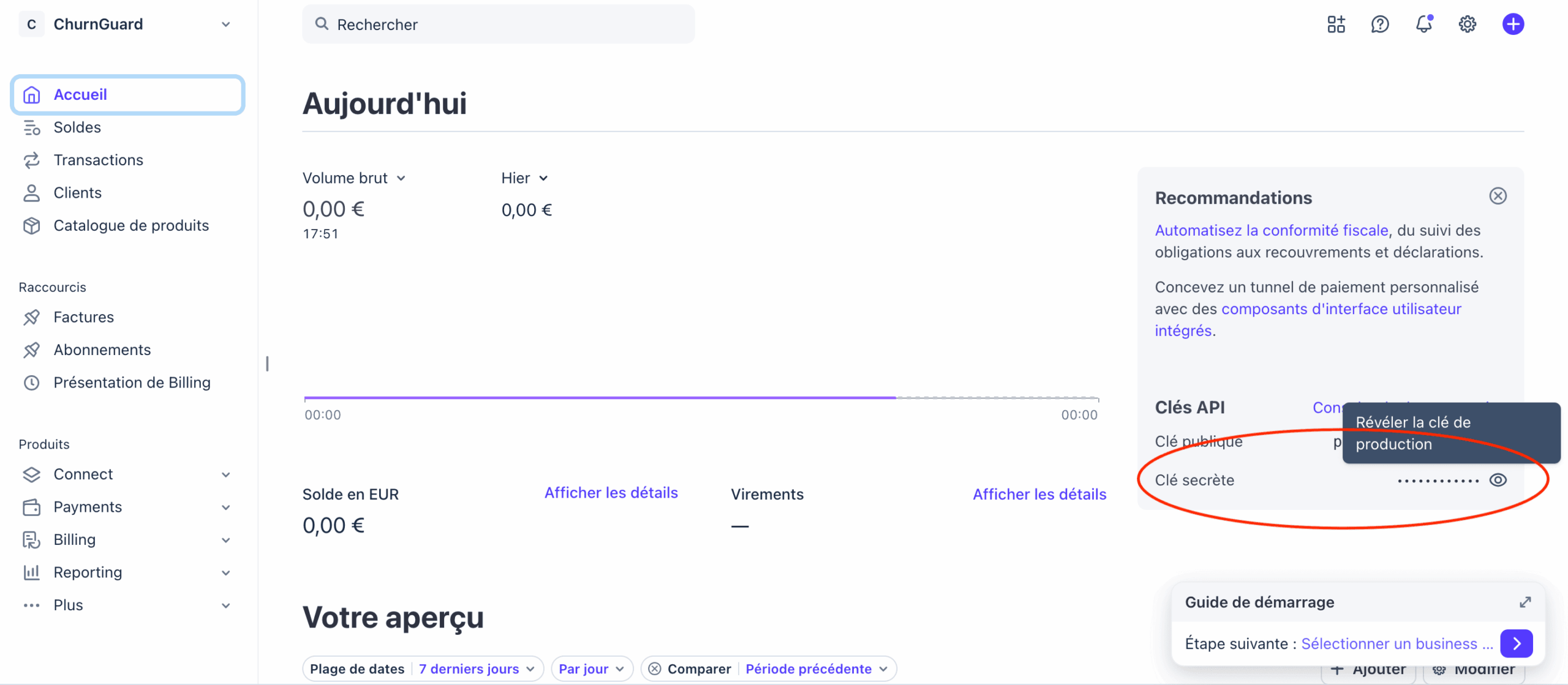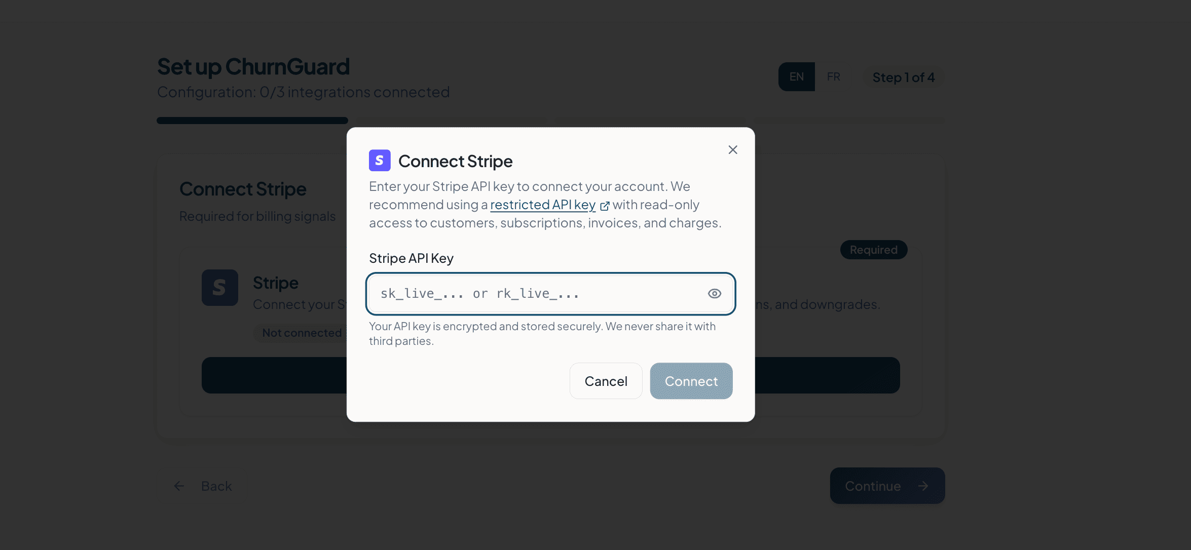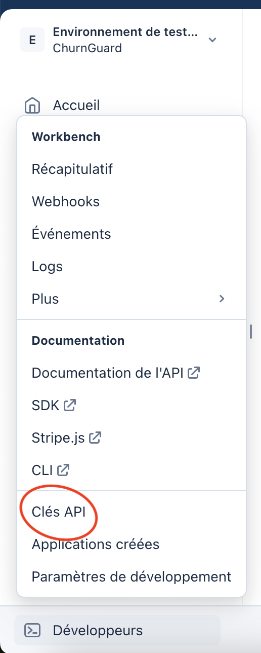 4- Copiez la clé (format sk_live_... ou rk_live_...) et collez-la dans le champ Stripe API Key de ChurnGuard.