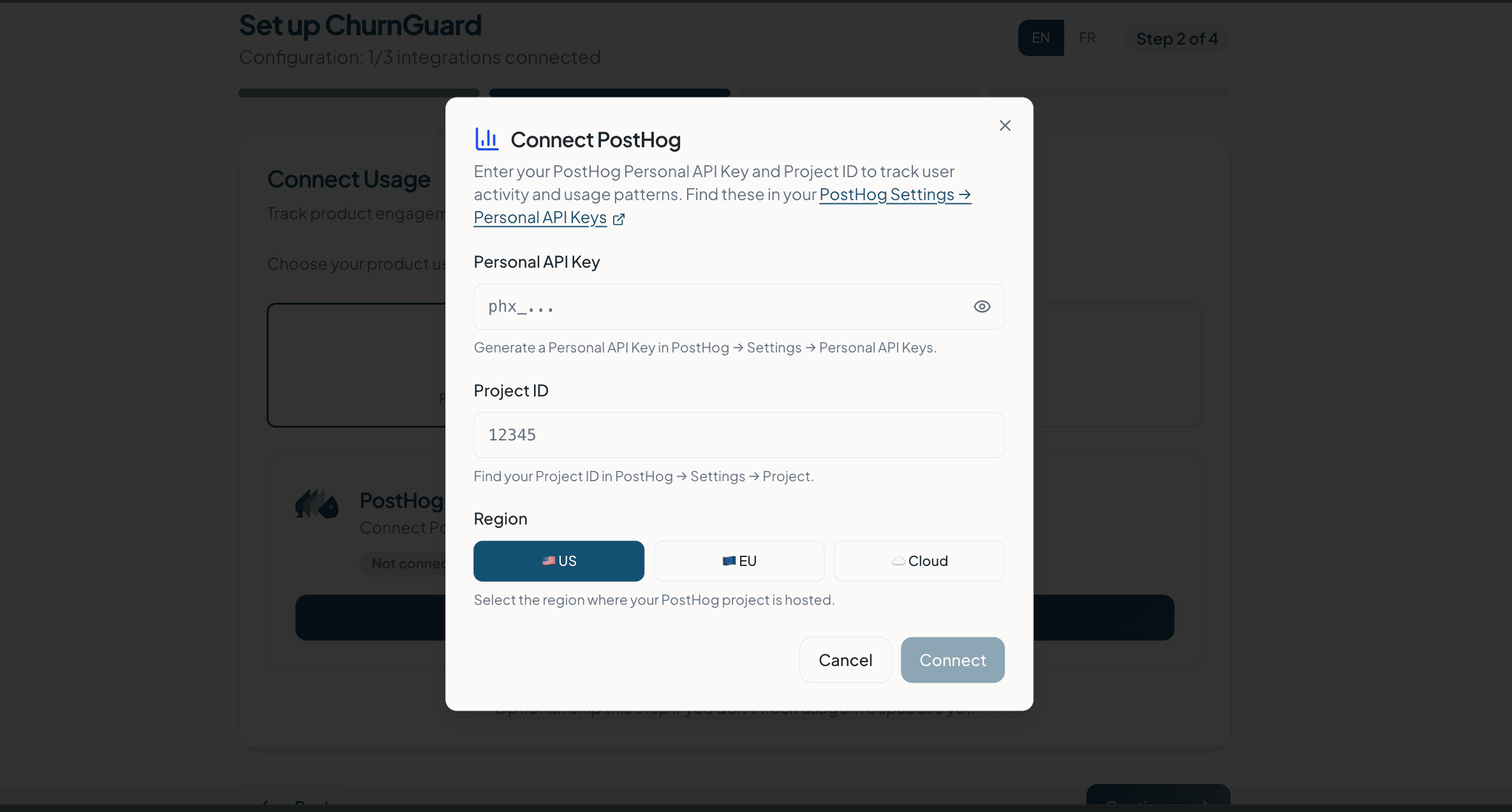 ⚠️ Cette étape est optionnelle. Si vous ne trackez pas encore l’usage produit, vous pouvez la passer et la configurer plus tard depuis Settings > Integrations.