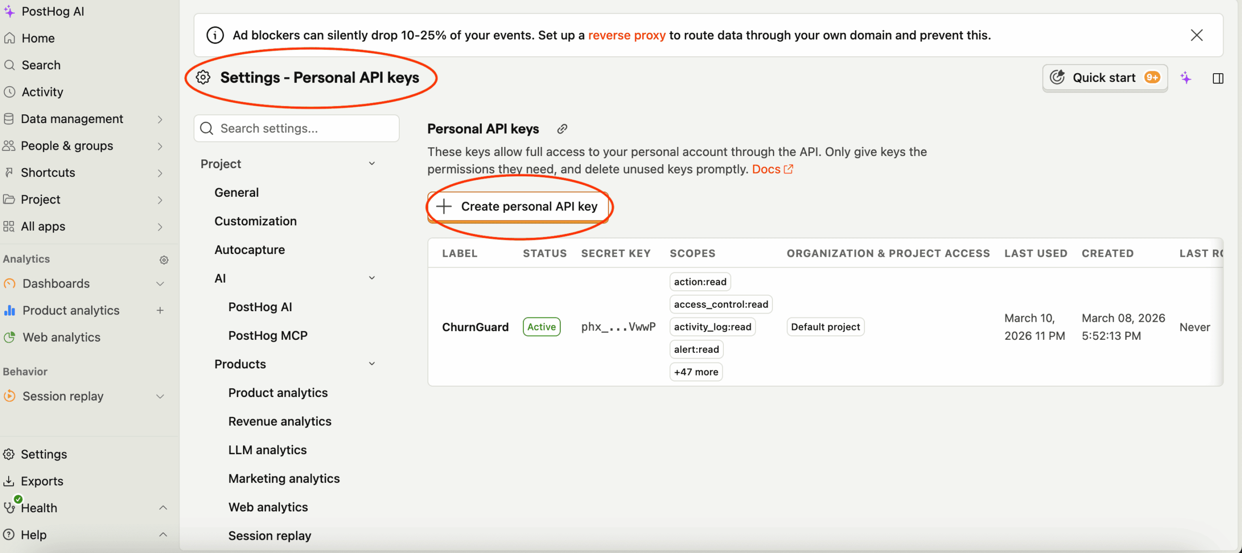3- Dans PostHog, rendez-vous dans Settings > Personal API Keys et créez une nouvelle clé personnelle.