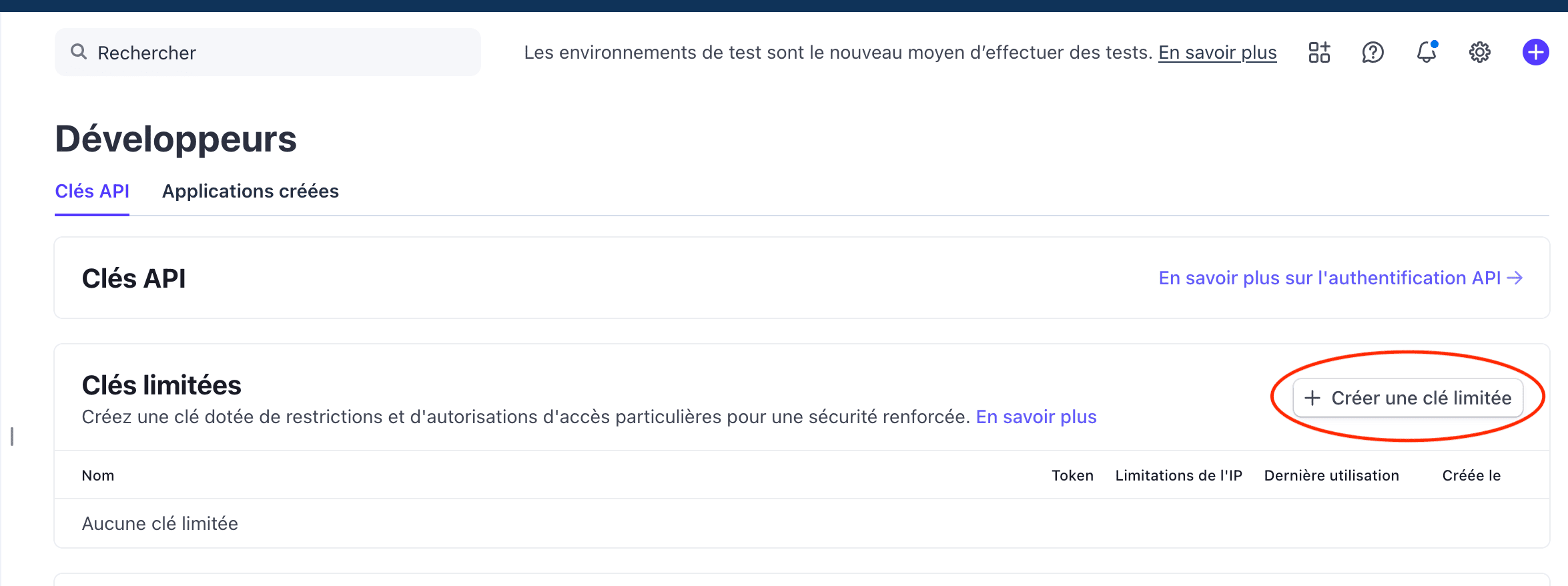 Si vous le préférez, vous pouvez vous rendre dans Developers et créer une clé restreinte (Restricted API Key).