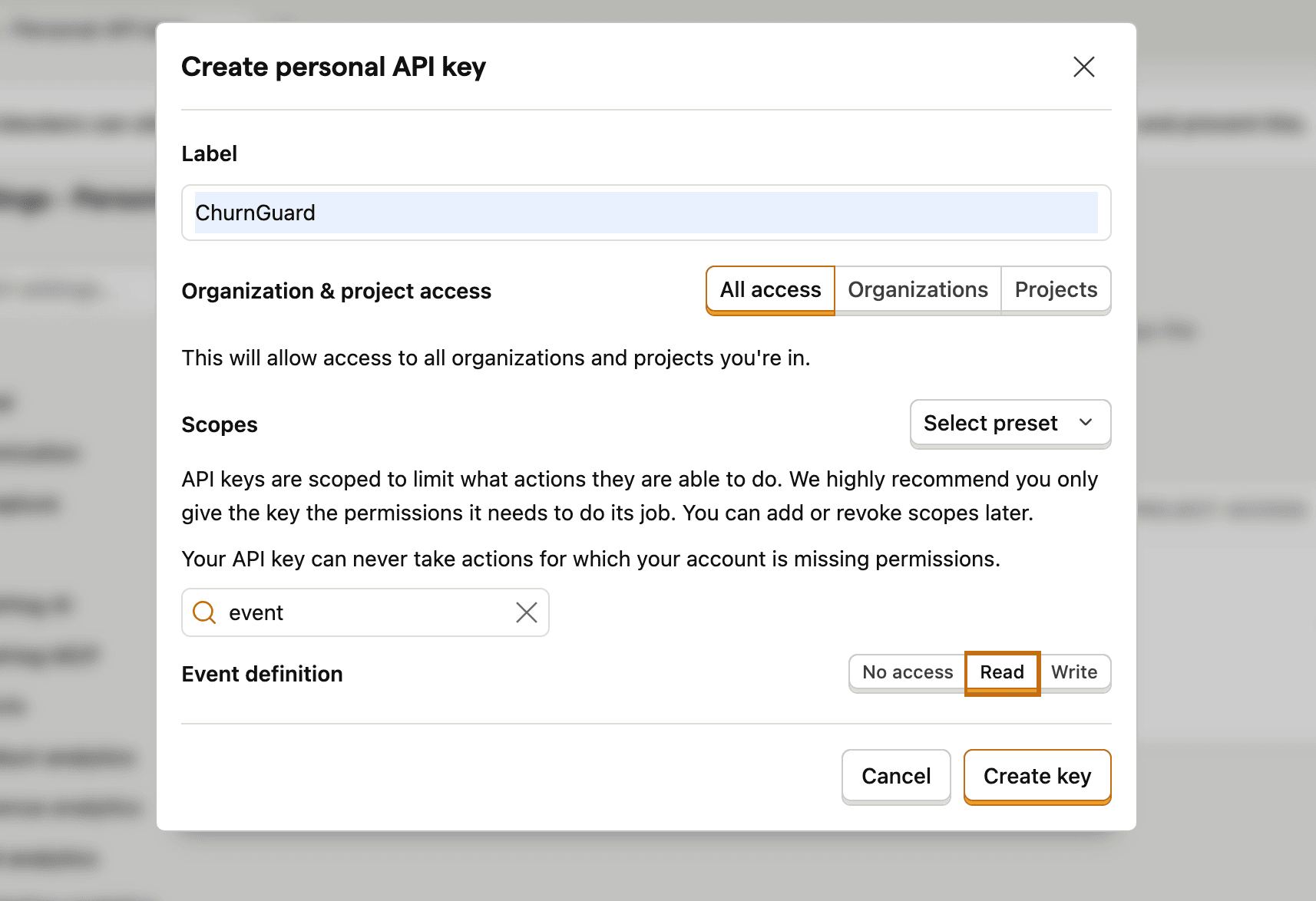 4- Dans le champ Label, nommez votre clé ChurnGuard pour la retrouver facilement.