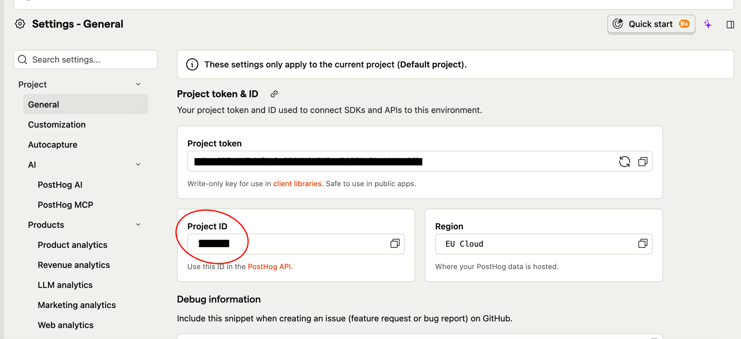 7- Renseignez votre Project ID, disponible dans PostHog > Settings > Project.