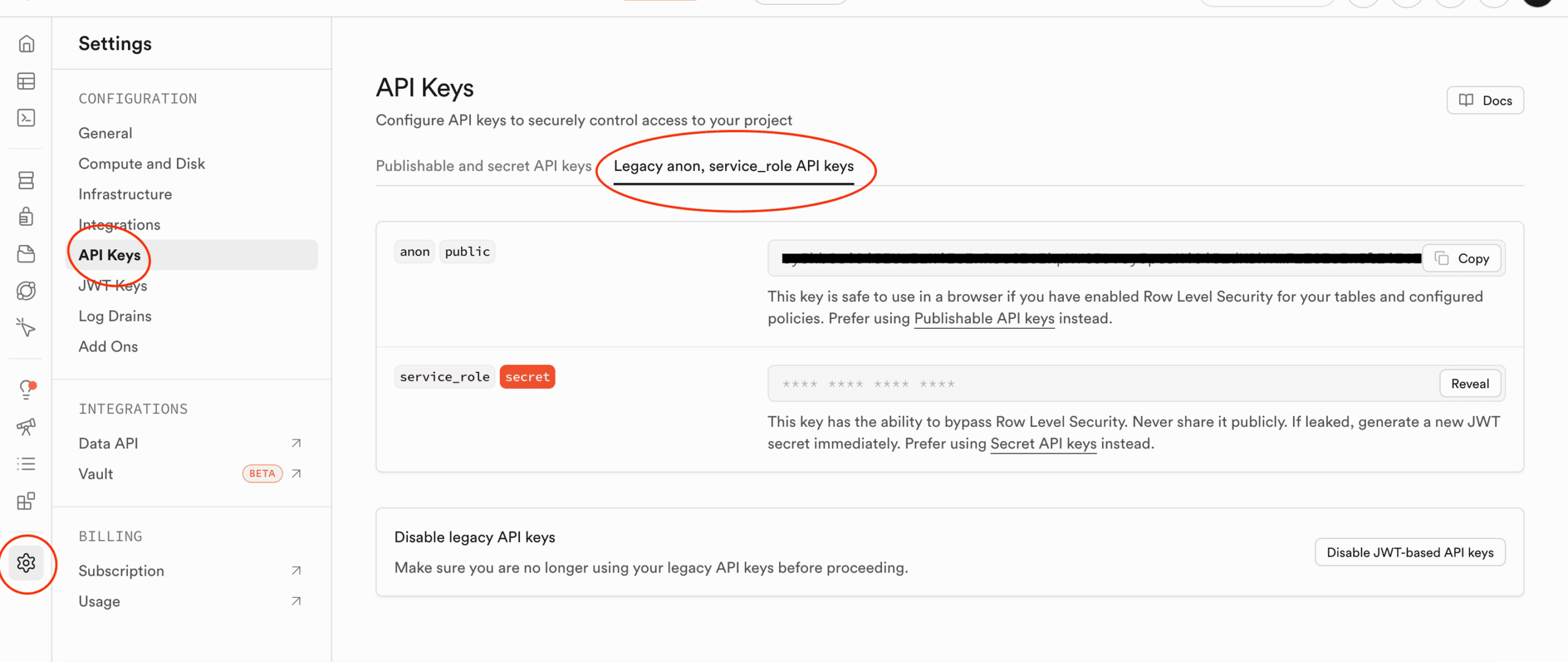 4- Rendez-vous ensuite dans Settings > API. Copiez votre Anon Key (clé publique) et collez-la dans le champ Anon Key. Copiez votre Service Role Key (clé secrète) et collez-la dans le champ Service Role Key. Cette clé est nécessaire pour détecter l’inactivité des utilisateurs.