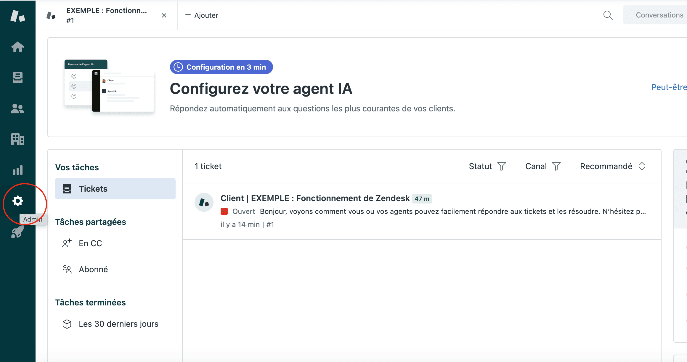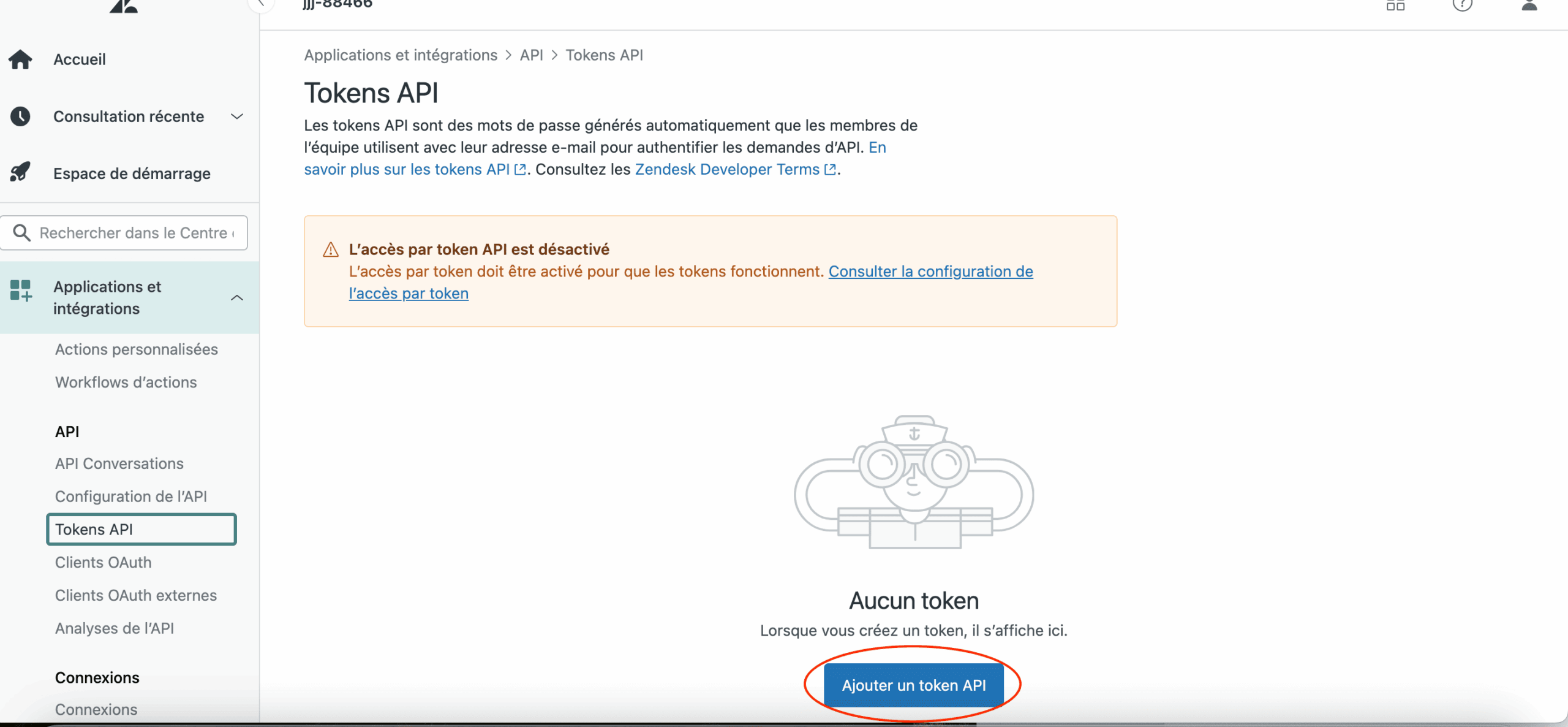 5- Générez un token API dans Zendesk Admin Center > Apps and integrations > APIs > Tokens API.
